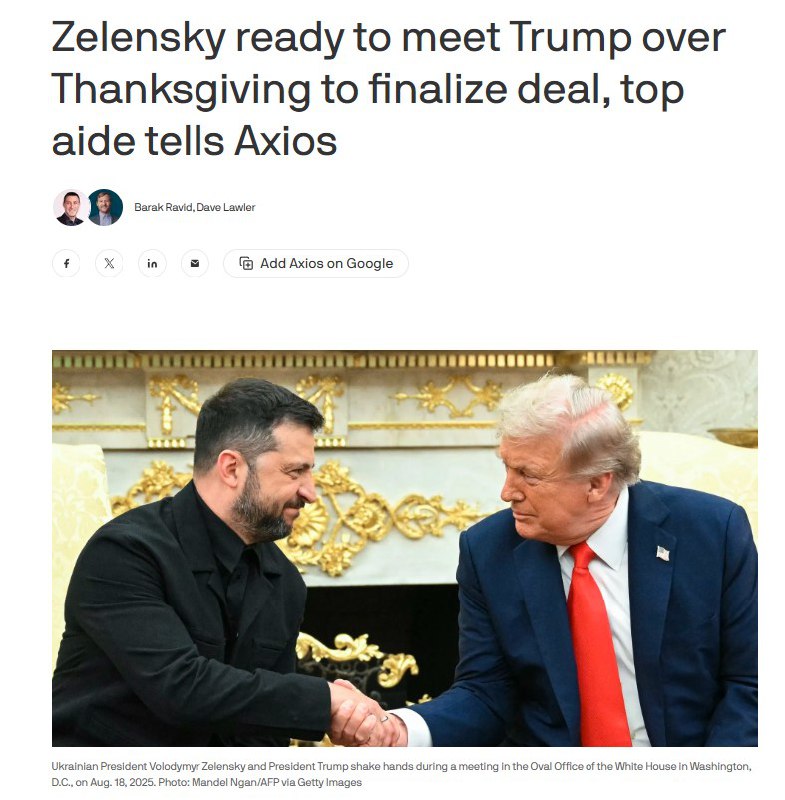 Украина президенті Владимир Зеленский АҚШ президенті Дональд Трамппен мүмкіндігінше тезірек кездесіп, американо-украиналық бейбіт келісім жобасын аяқтауға дайын екенін хабарлады. Бұл кездесудің Дәстүрлі алғыс айту күніне жоспарлануы да мүмкін, деп мәлімдеді Зеленский әкімшілігінің басшысы Андрей Ермак Axios басылымына. Келісім жобасын кейін Ресей қарауы тиіс, ол бастапқы нұсқамен жұмыс істеуге дайын екенін білдірген.